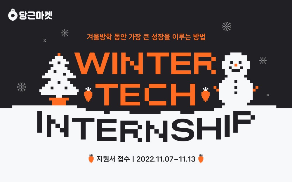 윈터테크 인턴십은 신입 테크 인재 양성을 위해 당근마켓이 2021년부터 여름과 겨울 방학 기간마다 진행하고 있는 시즌테크 인턴십의 일환으로 당근마켓 시즌테크 인턴십은 올해로 3회째를 맞았다. 평소 개발을 좋아하고 엔지니어를 꿈꾸고 있는 인재라면 재학 휴학 졸업 여부는 물론이고 전공 및 업무 경험에 관계없이 누구나 지원할 수 있다.