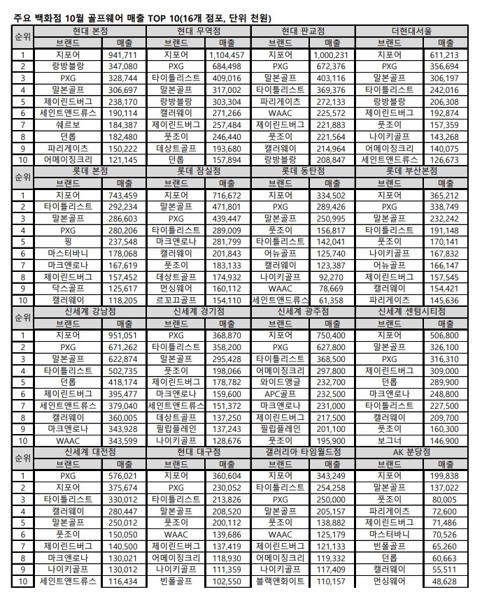 점포별로 보면 현대 본점에서는 ‘지포어’가 9억4171만원, ‘랑방블랑’ 3억4708만원, ‘PXG’ 3억2874만원이었고 현대 무역점 ‘지포어’ 11억445만원, ‘PXG’ 6억8449만원, ‘타이틀리스트’ 4억901만원, 현대 판교점 ‘지포어’ 10억23만원, ‘PXG’ 6억7237만원, ‘말본골프’ 4억311만원, 더현대서울 ‘지포어’ 6억1121만원, ‘PXG’ 3억5669만원, ‘말본골프’ 3억619만원으로 집계됐다.