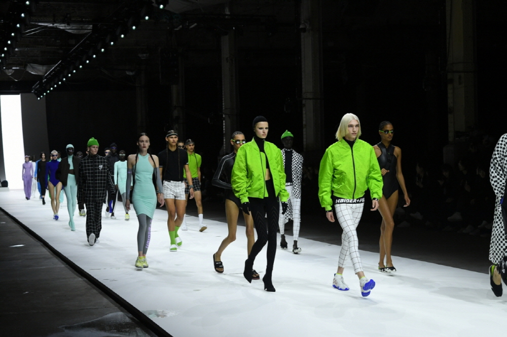 이번 컬렉션은 스포츠 복식의 핵심 요소인 탑과 바람막이, 트랙수트, 레깅스, 수영복에 봄버재킷 등의 아우터, 각종 슈즈와 액세서리 등으로 이뤄졌으며 하이더 아커만의 장기인 테일러링을 더해 정교하고 기술적인 디자인을 완성했다. 몸 위를 흐르는 듯한 유연한 실루엣 위에 강렬한 컬러, 유광에 바삭거리는 느낌의 이색 소재 등을 다채롭게 사용한 것도 돋보인다.