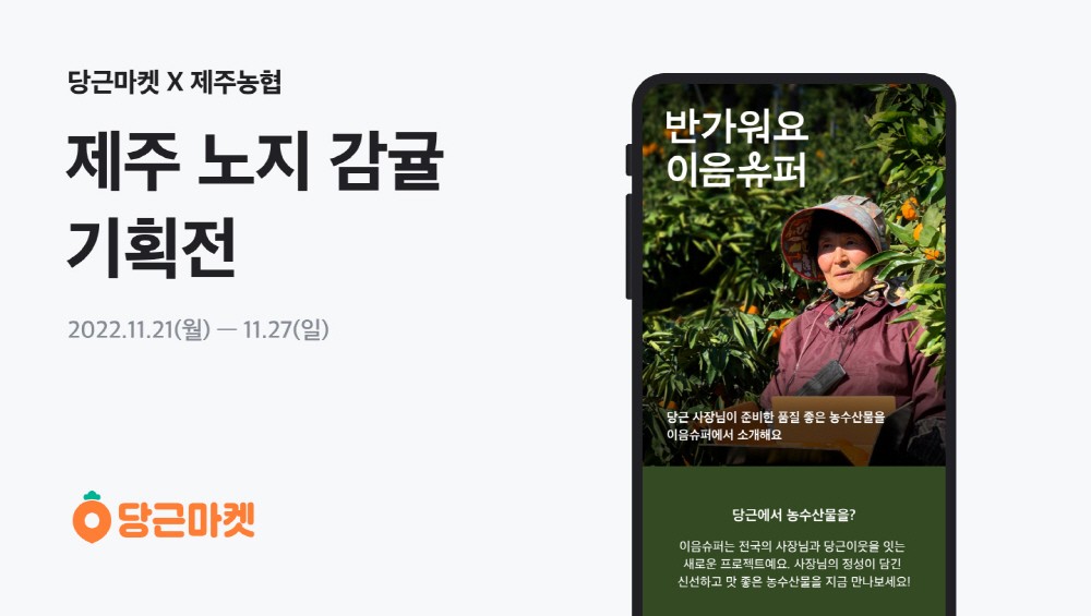 이음슈퍼의 첫 기획전은 제주 농협에서 판매하는 노지 감귤이다. 전국의 당근마켓 이용자들은 오늘(21일)부터 7일간 이음슈퍼를 통해 제주 노지 감귤 4kg을 9900원에 무료배송으로 구매할 수 있다. 당근마켓 홈피드에서 확인 가능하며 기획전 페이지에서 바로 상품을 구입할 수 있다. 오는 27일까지 1만명에게 감귤 구매 시 2000원이 할인되는 쿠폰을 선착순으로 제공하는 이벤트도 함께 진행된다.