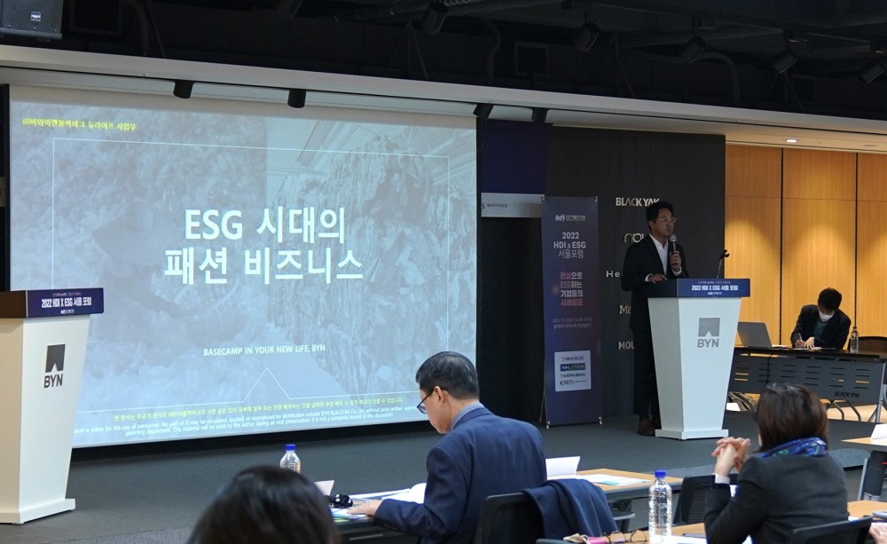 비와이엔블랙야크(회장 강태선)가 지난 23일 열린 2022 HDI X ESG 서울 포럼에 참가해 국내 투명 페트병 자원 순환 시스템을 소개했다.