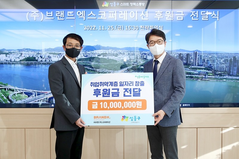 브랜드엑스코퍼레이션(대표 이수연 강민준)이 성동구청에 지역 경제 활성화 후원금 1,000만원을 기부했다.