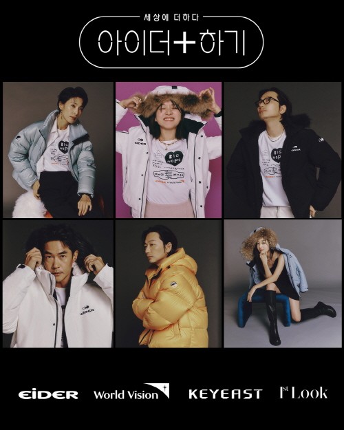 ‘아이더’는 선한 영향력을 나누는 아이더+하기 캠페인을 전개한다. 아이더+하기 캠페인은 국내외에 사회적 관심과 공감대 형성이 필요한 이슈를 유명인과의 협업을 통해 널리 알리고 함께 나누는 착한 캠페인으로 매년 다른 이슈를 선정하여 진행한다. 첫 번째 프로젝트는 우크라이나 어린이와 여성들에게 패딩을 선물하는 ‘Heat Ukraine with Eider’다. 이번 프로젝트에는 아이더와 월드비전, 키이스트, CJENM 퍼스트룩이 함께했다. 아이더는 월드비전과 협력해 약 4,000벌의 다운 자켓을 우크라이나에 전달했으며 CJENM 퍼스트룩 매거진에서 키이스트 소속 배우 5인(김서형, 고아성, 배정남, 이동휘, 한선화)의 스페셜 화보를 공개하며 평화의 메시지를 강조했다.