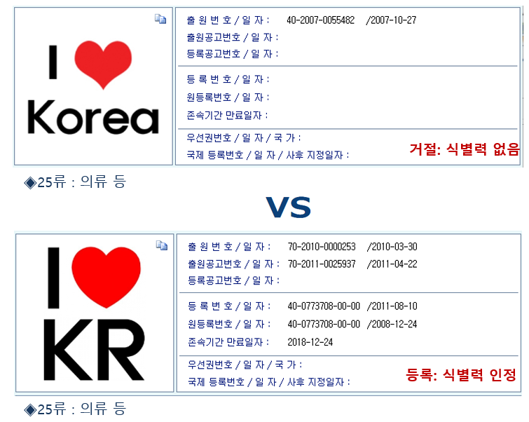 그럼 왜 I ♡ Korea / Believing is Being은 거절이되고, 이와 거의 동일한 I LOVE Korea / Believing is Being은 거절이 되었을까???? 특허청 심사관이 달라서 아니면 심사관의 착오???
