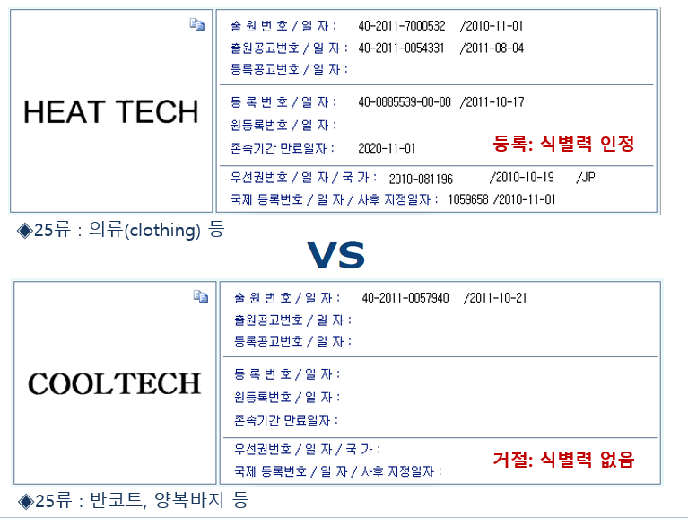 COOLTECH이라는 명칭은 그 상품 의류와 관련하여 "시원한 기술이 적용된 의류 제품"(상품 성질)이라는 의미를 가지므로, 상품의 성질을 나타내기 때문에 거절되었다. 그러면 HEAT TECH은 왜 등록이 되는 것일까? HEAT TECH이 유명해서????