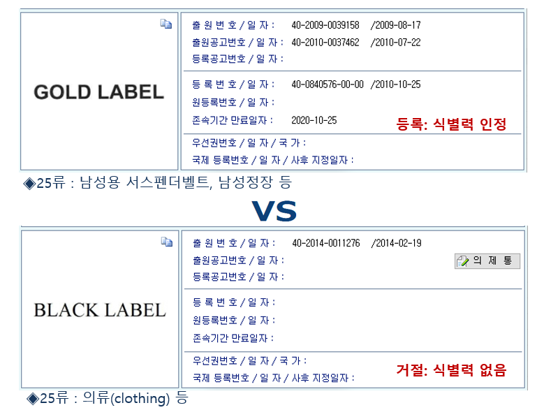 BLACK LABEL은 의류와 관련하여 의류의 등급(상품 성질)을 나타내는 명칭으로 인식되기 때문에 거절되었다. 그러면 왜 이와 비슷한 GOLD LABEL은 등록이 되는 것일까? GOLD LABEL이 출원했던 2009년에는 GOLD LABEL이 등급 표시가 아니어서????