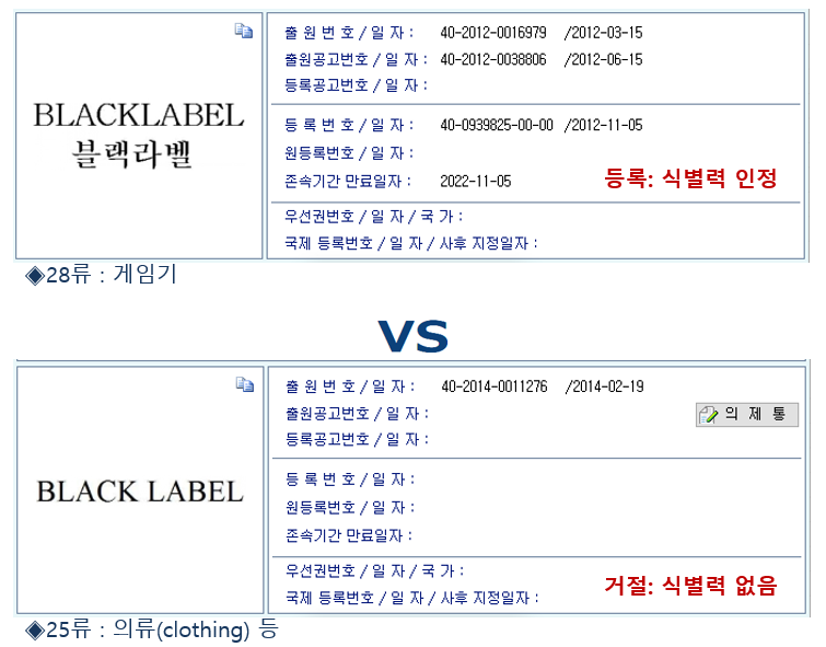 의류에 BLACK LABEL은 거절되었는데, 왜 게임기에 출원한 BLACK LABEL은 등록되었을까? 상품이 의류와 게임기로 다른 상품이고, 게임기와 관련해서 BLACK LABEL은 등급표시로 사용되는 경우가 실제 거의 없어서????