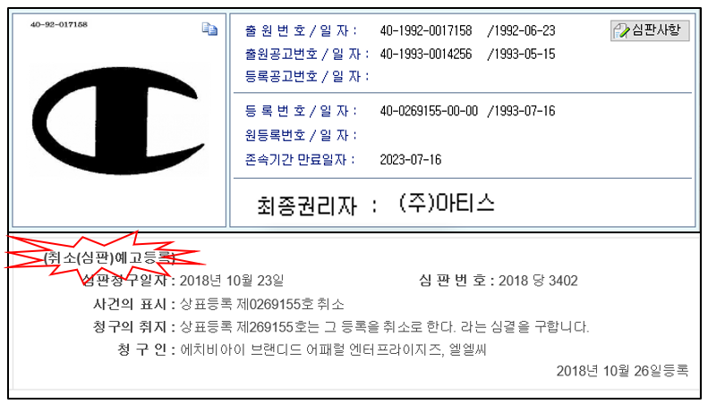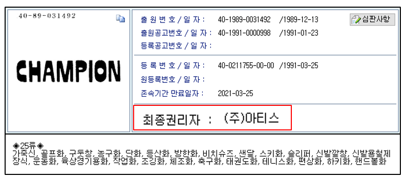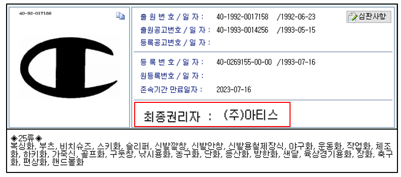 위 그림에서 볼 수 있듯이, 아티스는 CHAMPION 상표를 1991년에 로고를 1993년에 상표 등록을 하였다(정확히 말하면, 상표등록당시 시점에는 아티스가 상표등록을 한 것은 아니나, 그냥 편의상 현재 권리를 가지고 있는 아티스로 표현한다)