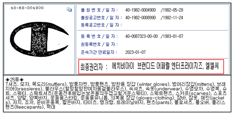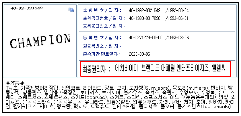 이는 국내에서는 Champion에 대해서 두 회사가 아래와 같이 상표권을 가지고 있기 때문이다.