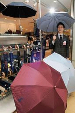 고베 소고 백화점에 들어선 양산 특설매장 ‘양산 든 남자’는 접이식, 우산 겸용 양산을 비롯해 다양한 컬러의 양산이 진열하고 6,000~7,000엔에 판매하고 있다.