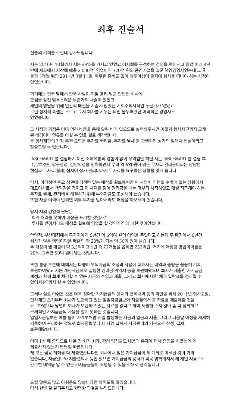 이것은 이 기록의 마지막 순간을 위해 남겨 놓을까 고민을 하다가 ABC-MART와의 지난 10년간의 지난한 싸움을 예고하는 복선으로 공개하는 것도 괜찮을 것 같다고 생각했다. (최후 진술서는 아래 사진으로 대신합니다.)