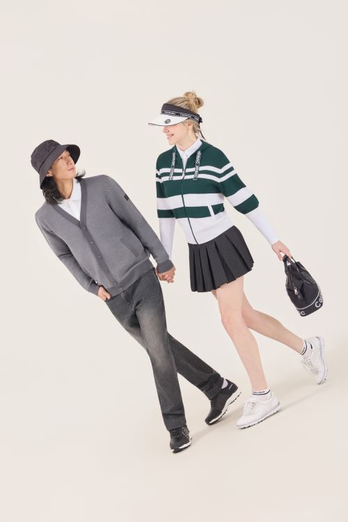 또한 그레이 니트 카디건과 데님 팬츠, 버킷햇을 조합한 룩은 도심 속 캐주얼룩처럼 일상복과 경계를 허문 스타일링으로 눈길을 끈다. 딥그린 바탕에 화이트 스트라이프가 들어간 집업 니트 재킷에는 차콜색의 플리츠 스커트를 매치했으며 브랜드 심벌 선바이저와 로고 파우치백으로 포인트를 줬다.