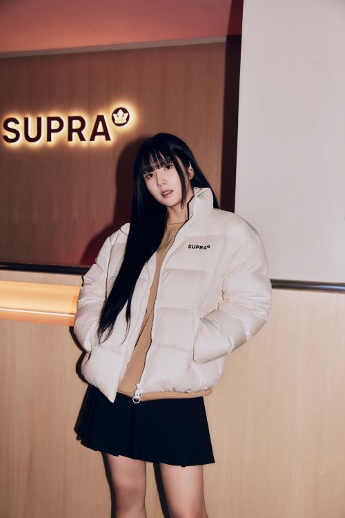 특히 권은비는 수프라 메인 아이템 ‘아웃도어 립스탑 투톤 배색 숏 다운 자켓’을 착용, 아우터 하나만으로도 그녀만의 매력을 가득 담은 스트릿 무드를 자아냈다. 여기에 올블랙 컬러가 특징인 수프라의 ‘베이더 X 운동화’ 제품을 매치해 압도적인 비율로 강렬한 스타일링을 선보였다.