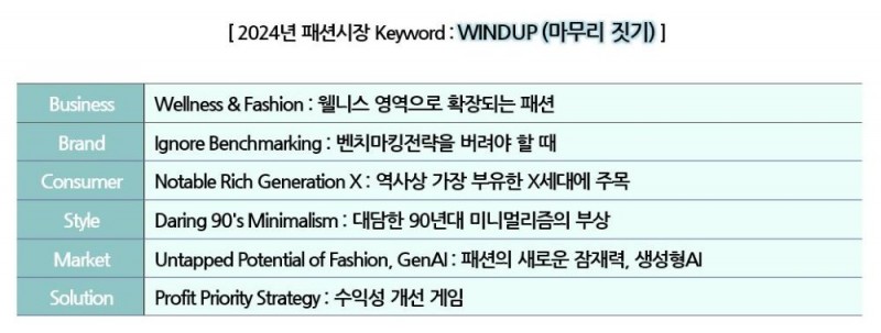 임지연 삼성패션연구소장은 “경기불황이 장기화 조짐을 보이며 불안한 성장을 지속해온 패션 마켓, 2023년 잠시 숨을 고르는 브레이크포인트를 지나왔다. 다가올 2024년은 우울한 상황을 정리할 마무리 짓기가 필요하며 게임을 끝낼 마지막 한방을 위한 투수의 준비 동작처럼 크게 팔을 뻗는 ‘와인드업’이 중요하다는 중의적 의미로 ‘와인드업(WINDUP)’을 내년의 키워드로 제안한다”라고 말했다.