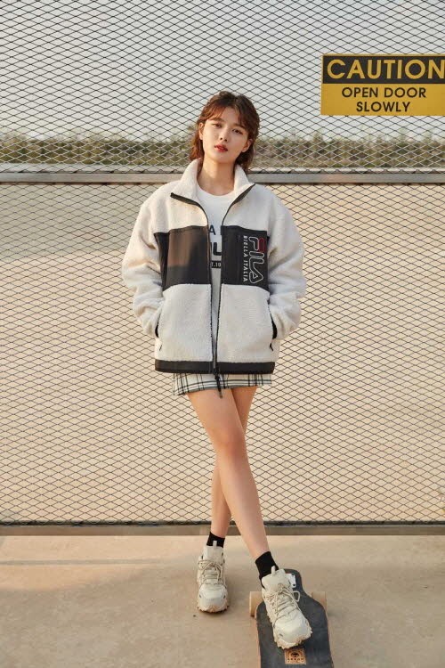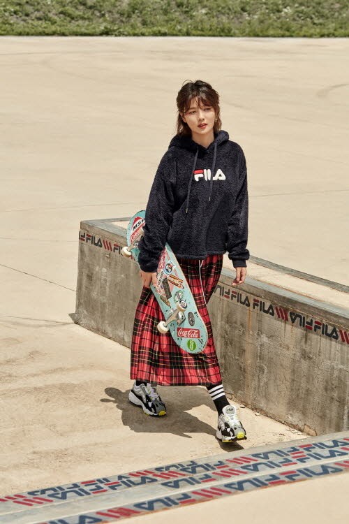 시크한 스케이터 보더로 변신한 김유정은 보기만 해도 포근한 휠라 팝콘 보아 플리스에 타탄 체크 스커트, 트레일 무드가 반영된 과감한 아웃솔의 어글리 슈즈 오크먼트 TR 슈즈, 빅 로고가 돋보이는 컬러 블럭 맨투맨에 대표 어글리 슈즈 휠라바리케이드XT97 테이피테잎 등을 매치, 경쾌하면서도 스타일리시한 가을 패션을 연출했다.