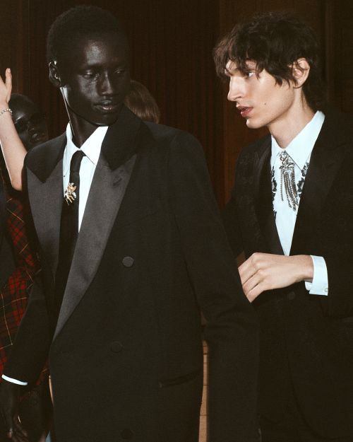 전통적인 포멀 룩에서 벗어나 강렬한 메탈 장식과 풍부한 질감이 어우러진 대조적인 스타일을 선보였다.