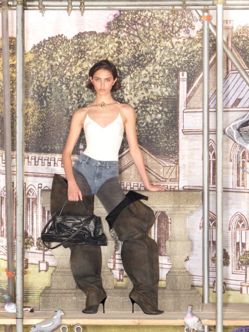 레디 투 웨어가 기본 아카이브를 중심으로 구성된 반면 액세서리 라인은 보다 강렬한 포인트를 선보인다. 그중 키 아이템인 라바 백은 컬렉션 전반에 적용된 포일과 와이어 기법을 활용했으며 모조 가죽과 대담한 블루 데님으로 제작되었다. 손으로 주름을 잡거나 늘려 다양한 형태로 변형할 수 있어 어떤 룩에도 즉각적인 다이내믹함을 더해준다.