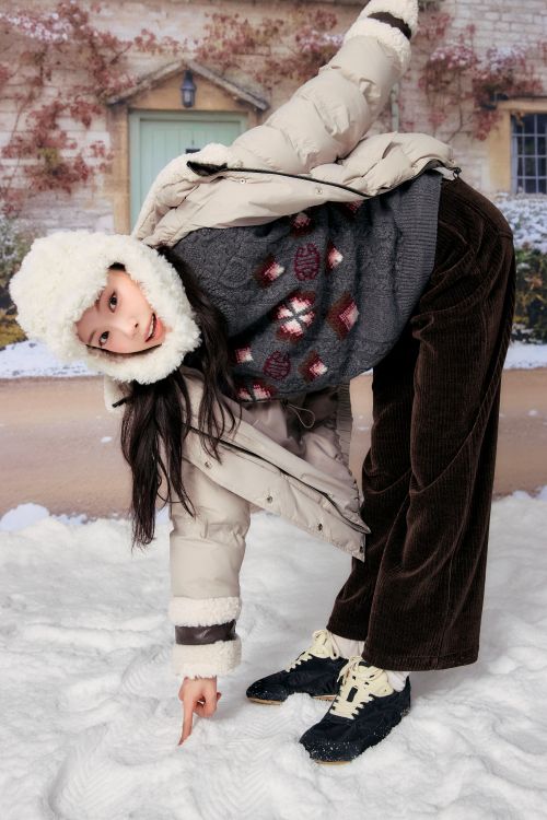 공개된 화보와 영상 속 손나은은 고급스러운 광택감이 도는 패딩 점퍼와 플라워 패턴 배색 니트, 그리고 와이드핏의 코듀로이 팬츠를 매치해 포근한 겨울 코디를 선보였다.