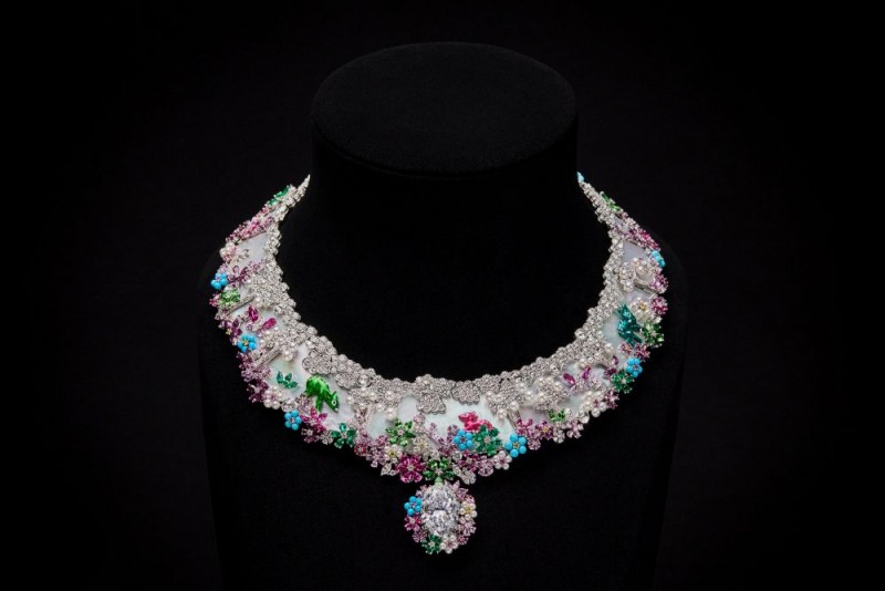 마더 오브 펄을 배경으로 다이아몬드, 진주, 젬스톤이 조화롭게 세공된 이 네크리스는 자연의 아름다움과 빛의 리듬을 섬세하고 또 다채로운 컬러의 유희를 표현하며 ‘디올’만의 예술적 감성을 드러낸다.