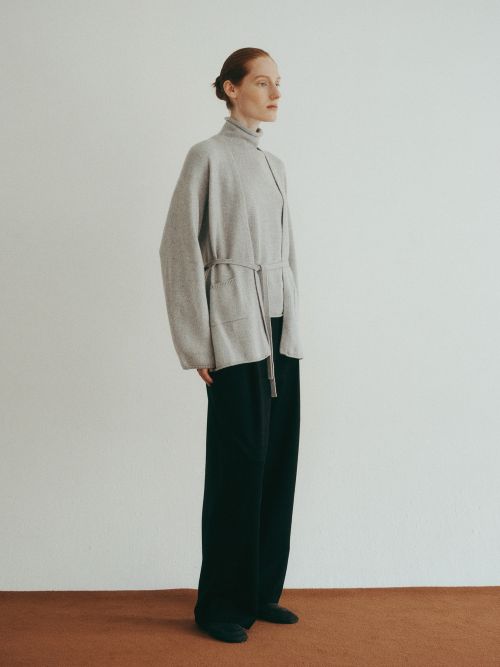 먼저 대표 제품인 ‘아이코닉 더블 스티치 코트’는 이탈리아 콜롬보사의 100% 캐시미어 원단을 사용했다. 모직 표면에 물결무늬를 만들어내는 지블링 공법으로 은은한 광택과 깊이 있는 질감을 구현했으며 부드럽게 떨어지는 어깨선과 섬세한 스티치 디테일이 어우러져 우아한 실루엣을 완성했다.