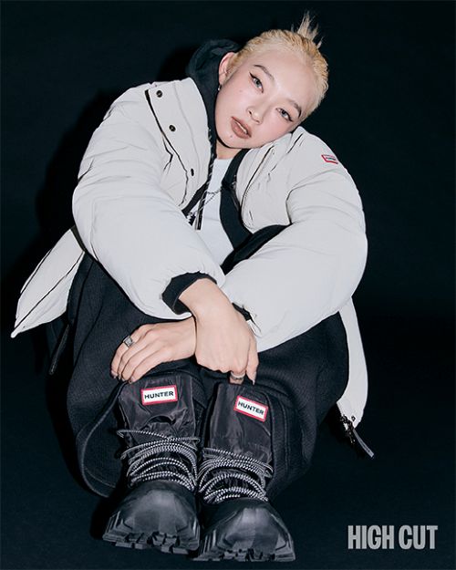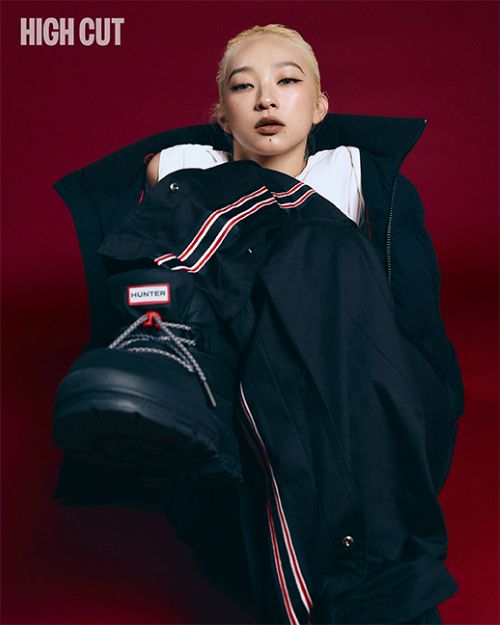 이어지는 컷에서는 ‘인앤아웃 다운자켓’과 ‘익스플로러 온 푸퍼 레이스업 부티’를 착용해 시크한 올블랙 룩을 선보였으며 강렬한 레드 배경과 함께 KYOKA 특유의 카리스마와 스타일링의 임팩트를 한층 더 부각시켰다.