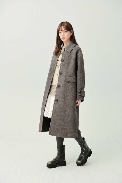 마지막으로는 멜란지 베이지 컬러의 루즈핏 핸드메이드 롱코트에 브라운 트임 니트와 화이트 레이스 티셔츠를 레이어링하고 연청 와이드 데님 팬츠를 매치해 감각적인 겨울 데일리룩을 완성했다.