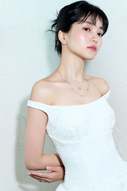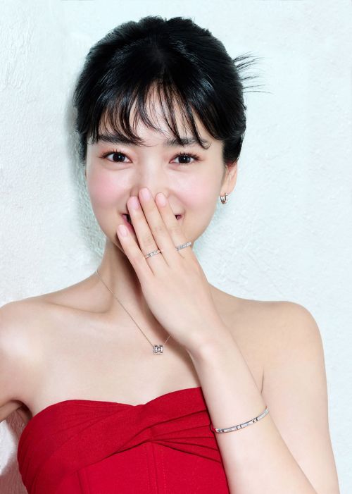 수줍은 듯 입을 가린 채 설렘 가득한 미소를 지은 김태리는 ‘리에또’ 주얼리를 완벽하게 소화했다. 리에또 컬렉션은 선물 상자에서 착안한 큐브 형태의 입체적인 디자인으로 포장을 여는 순간의 설렘을 표현한 것이 특징이다. ‘골든듀’의 독보적인 풀미러폴리싱 기술이 적용된 18K 화이트 골드 위로 마이크로 파베 세팅된 다이아몬드가 어우러져 섬세하고 입체적인 사각 프레임의 아름다움을 완성했다.