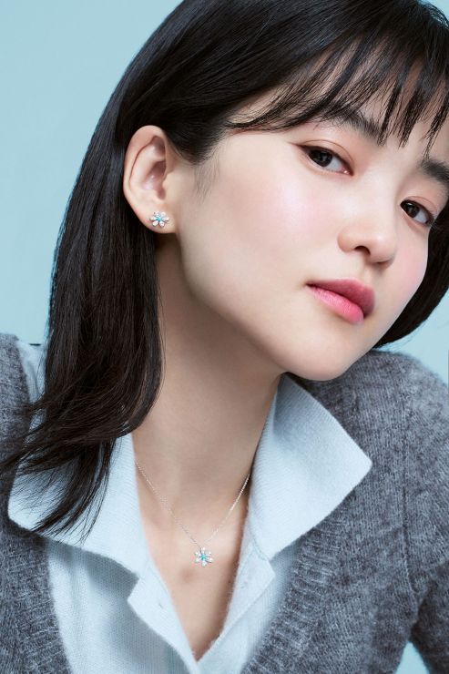 마지막 화보 속 김태리는 맑고 투명한 눈빛으로 카메라를 응시하며 ‘블러썸듀’ 컬렉션을 착용해 청초한 분위기를 완성했다. 눈 사이로 피어난 이슬 꽃을 표현한 ‘블러썸듀’는 18K 화이트 골드와 파베 세팅된 다이아몬드로 눈 덮인 하얀 꽃잎을 표현했으며 중심에는 터쿼이즈를 세팅해 신비로운 겨울의 색감을 강조했다. 트라이앵글 형태로 배열된 꽃잎들이 서로 다른 높낮이로 배치되어 리드미컬한 입체감을 선사하는 것이 특징이다.