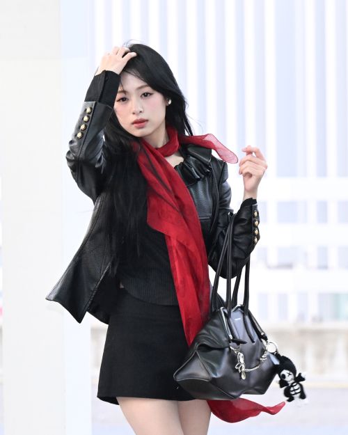 아현은 블랙 라이더 재킷과 미니스커트에 맥퀸의 레드 실크 시폰 소재 스컬 스카프로 포인트를 더하고 ‘맥퀸’ 2026 봄/여름 프리 컬렉션의 블랙 레더 만타 백에 샹들리에 체인과 캐릭터 참을 장식해 록시크 무드를 연출했다.