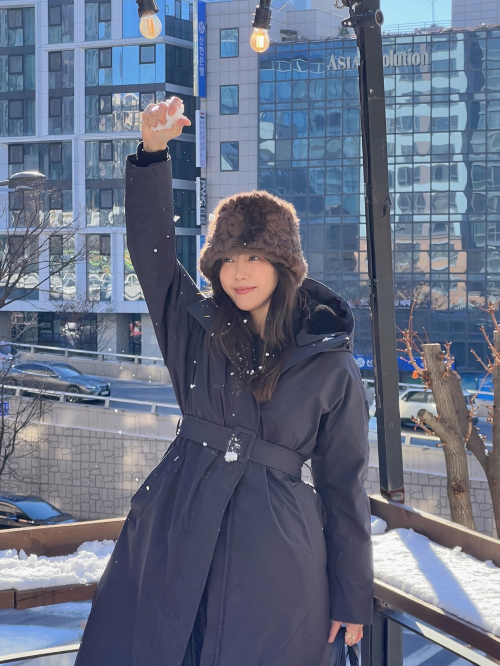 채정안은 볼륨감 있는 실루엣의 블랙 벨티드 롱패딩에 블랙 롱 부츠를 매치해 페미닌하면서도 센스있는 올블랙 패션의 정석을 보여주었다.