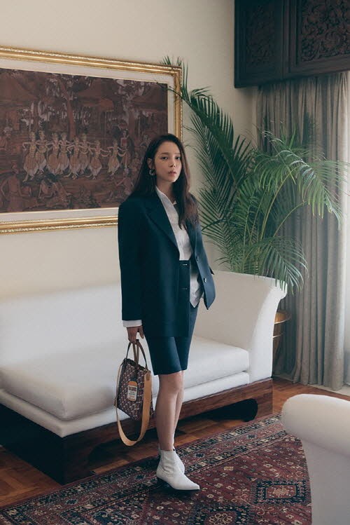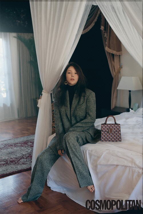 박시연은 화보에서 다양한 수트 룩을 선보이며 시크한 매력을 드러냈다. 오버사이즈 그레이 수트에 모던한 스퀘어 디자인과 모노그램 패턴이 돋보이는 ‘로사케이’의 아미 플랩 토트백을 매치하여 매니쉬한 스타일에 고혹적인 분위기를 연출했다.