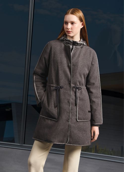여성 모델이 착용한 ‘후드 구스다운 코트’는 코트형 실루엣으로 슬림하면서도 단정한 라인이 돋보이는 아이템이다. 허리 스트링 디테일을 더해 체형에 맞게 조절할 수 있으며 미니멀한 포켓 디자인과 차분한 컬러 조합이 고급스러운 분위기를 연출한다. 또한 후드 라인은 이중으로 디자인해 유니크한 포인트를 더했다.