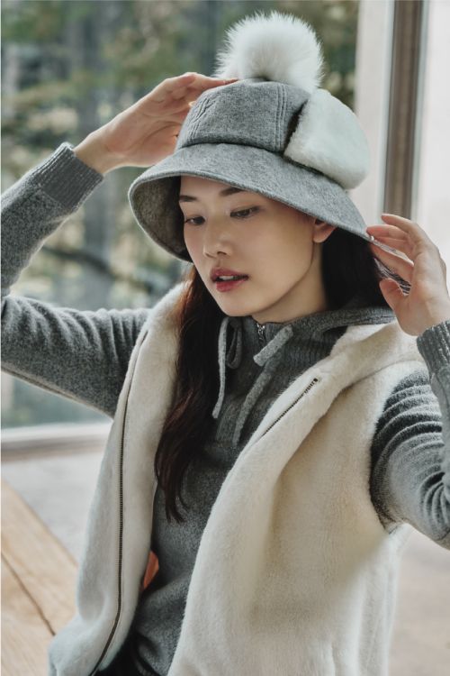 여성 모델이 착용한 ‘에코퍼 후드 베스트’는 부드러운 퍼 소재로 따뜻하며 편안한 착용감이 특징으로 간결한 디자인에 은은한 광택을 더해 고급스러운 분위기를 완성한다. 또한 후드 디테일로 겨울 시즌 데일리 레이어드 아이템으로 활용도가 높다. 함께 매치한 ‘리얼 폭스퍼 버킷햇’은 탈부착 가능한 퍼 방울 디자인으로 다양한 스타일에 맞춰 연출 할 수 있다.