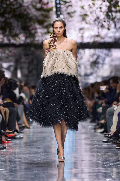 섬세한 실크 재단과 자수, 층층이 쌓인 쉬폰과 오간자, 꾸뛰르 영역으로 확장된 니트웨어는 디올 하우스의 언어를 한층 확장한다.