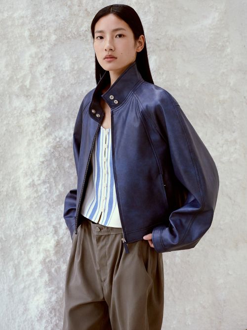 그중 부드러운 터치감과 광택이 돋보이는 스탠드 칼라의 인조 레더 점퍼는 비대칭 여밈으로 유니크한 디테일을 더했고 뒤쪽은 밴딩 마감으로 편안하고 자연스러운 실루엣을 연출했다.