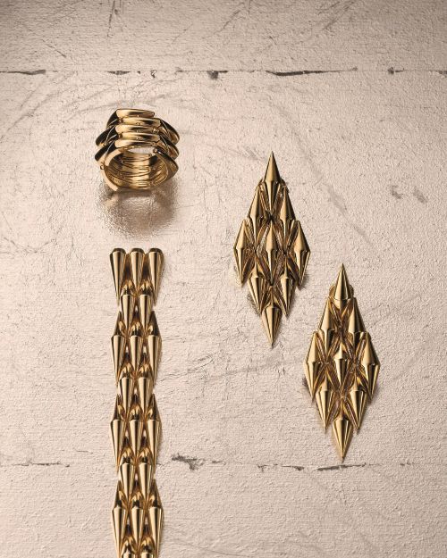 옐로 골드, 대담한 블랙 DLC, 까레 세팅 다이아몬드 파베가 어우러진 비전적 조합은 극도로 현대적인 텍스처를 완성한다. 수평과 수직 구조로 제작된 초커, 클래식 네크리스, 아방가르드한 폰초 스타일 디자인까지 폭넓게 선보인다. 또한 ‘불가리’ 이터널 컬렉션의 여정은 아카이브 홀마크 ‘BE’와 함께 이어진다. 이는 헤리티지와 상상력, 그리고 지속되는 예술성을 상징하는 브랜드의 인장이다.