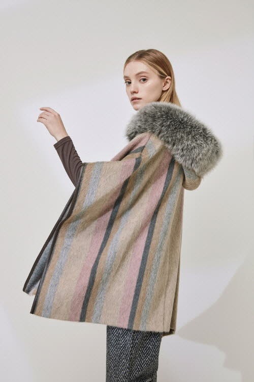 ‘LBL’의 알파카 폭스 퍼 판쵸 코트는 트렌디한 컬러 블록과 다양한 룩에 활용도가 높은 디자인이 특징이다. 후드 부분을 풍성하게 휘감은 천연모피는 우아하고 세련된 스타일링을 도와주며 실제로 사용 가능한 포켓과 여밀 수 있는 스냅단추로 한겨울까지 따뜻하게 레이어링 가능하다. 오렌지, 핑크, 네이비 세 가지 컬러로 구성돼 개인의 취향에 맞게 선택하면 된다.