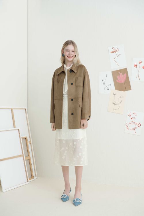 브라운 컬러의 스웨이드 하프 재킷은 부드러운 터치감과 힙을 덮는 여유로운 오버핏 실루엣으로 다양한 이너와 레이어링하기 좋으며 올리브 컬러의 스탠카라 레더 재킷은 은은한 광택과 크롭 기장이 돋보이는 아이템으로 트렌디한 아웃핏을 완성할 수 있다.