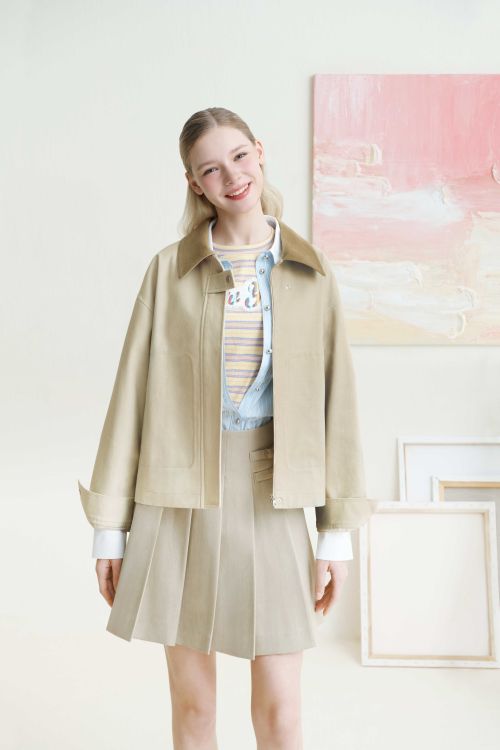 마지막으로 라이트 베이지 컬러의 배색 카라 코튼 재킷은 코듀로이 카라 배색 디테일을 더해 캐주얼하면서도 유니크한 무드의 봄 데일리룩을 연출할 수 있다.