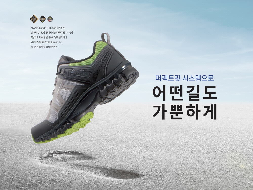 레드페이스(대표 유영선)가 생체역학 설계로 오래 걸어도 발이 편안한 콘트라 PFS 팔콘 워킹화를 출시한다.