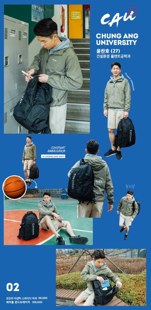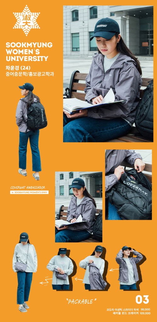 스타일링 가이드에서 각 학교를 대표하는 엠버서더가 착용한 패커블 윈드브레이커는 ‘커버낫’에서 매년 꾸준히 선보이는 스테디셀러 아이템으로 20 SS 시즌을 맞아 기존 제품 보다 한 층 업그레이드되어 출시됐다.