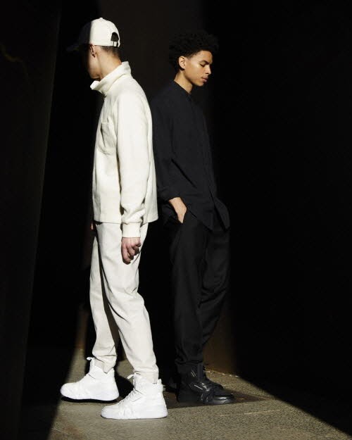 농구화처럼 발목 부분이 높게 올라오는 하이-톱 스니커즈로 깔끔하게 떨어지는 라인이 돋보인다. 다양한 패턴과 소재를 조합해 완성한 디자인은 마치 번화한 대도시의 느낌을 연상시킨다.