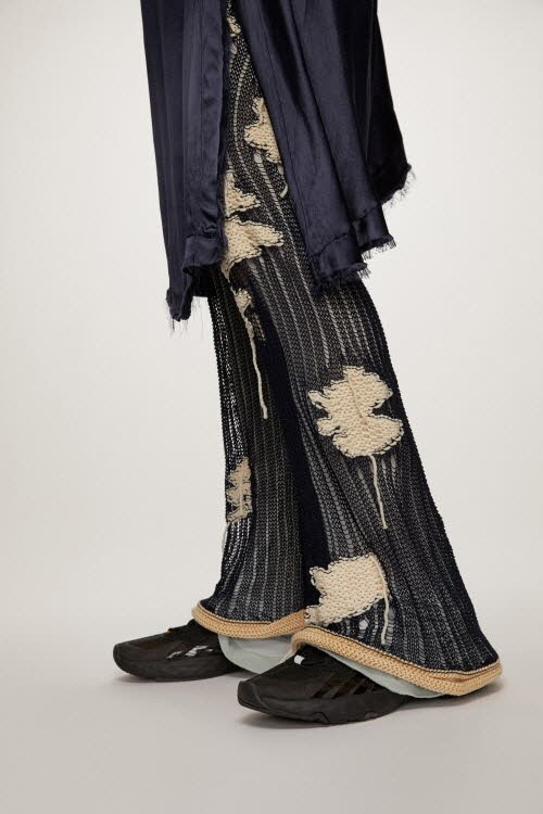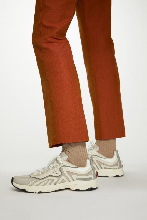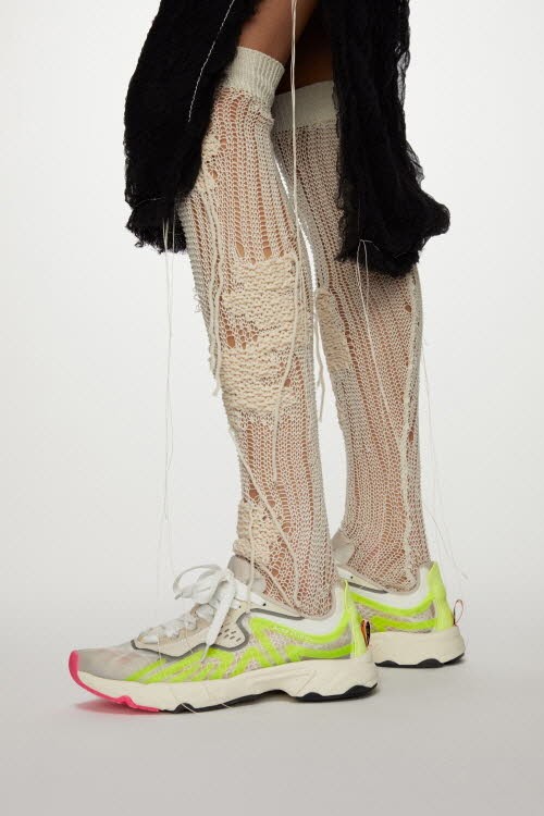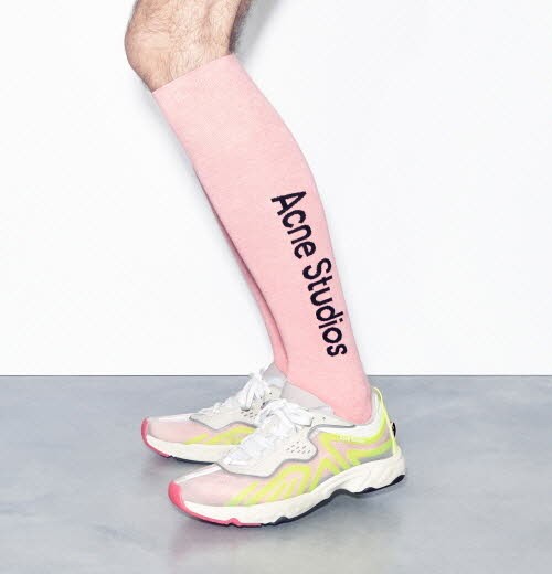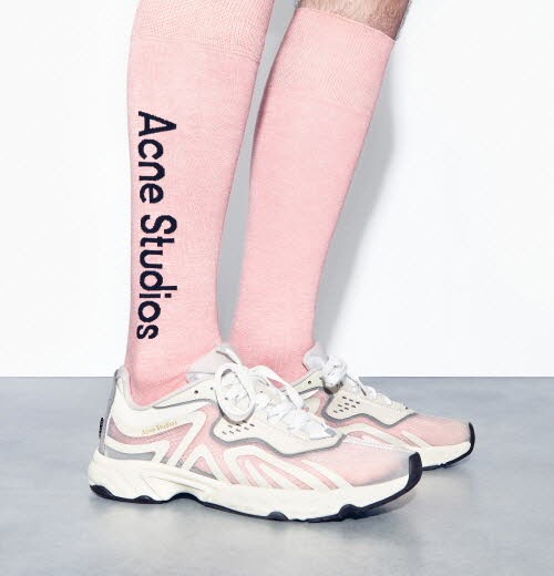 레이스업 형태의 스니커즈 앞면은 인조 스웨이드 아일렛, 메쉬 소재의 안감으로 제작되었으며 옆면을 따라 굵은 라인으로 포인트를 주어 매끈한 형태뿐만 아니라 움직임도 더해주었다. ‘아크네 스튜디오’의 로고 탭은 스니커즈의 뒷면에 부착되어 있다.