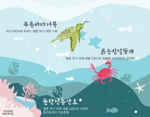 멸종 위기 해양생물 중 푸른바다거북, 둔한진총산호, 붉은발말똥게 3가지를 아트웍으로 티셔츠에 담아 멸종위기 종을 알린다. 남성, 여성, 키즈 제품으로 구성되어 있으며 재활용 가능한 백을 패키지로 제공한다.