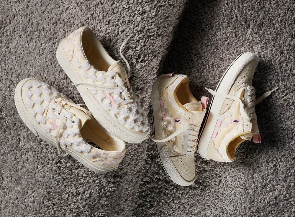 이번 컬렉션은 독특한 디테일의 올드스쿨 캡 스타일도 함께 만나볼 수 있다. 아이코닉한 클래식 실루엣 올드스쿨을 오려내고 잘라낸 듯한 느낌의 독특한 컷 앤 페이스트 디테일을 더해 재해석한 스타일로 잘 알려져 있다. 마찬가지로 셔닐 소재를 이용한 체커보드 패턴이 어퍼와 사이드 패널에 더해졌고 노출된 폼 스트립과 뒤축에 더해진 핑크색 컬러 블록으로 마무리했다.