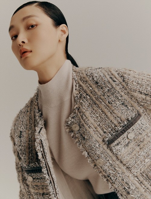 다양한 소재 조합으로 독특한 크롭 트위드 재킷과 캐주얼한 울 혼방 팬츠의 고급스러운 믹스 앤 매치 스타일링을 제안했다. 헤링본 패턴의 더블 재킷에 레터링을 입힌 실크 혼방 원피스를 매치해 따뜻한 소재와 광택 있는 소재와의 멋스러운 조화도 보여줬다.