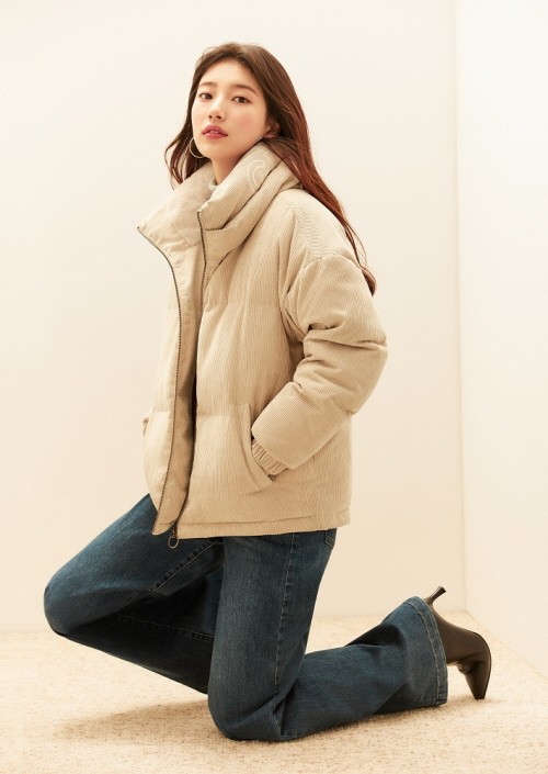 하이넥 카라가 포인트인 코듀로이 소재의 패딩 점퍼를 데님 와이드 팬츠와 함께 매치해 활용도 높은 데일리 룩을 선보이는 한편, 꾸준히 사랑받고 있는 테디베어 코트의 숏 기장 버전을 착용해 최근 점점 가벼워지고 있는 겨울 아우터 트렌드를 그대로 보여주고 있다.