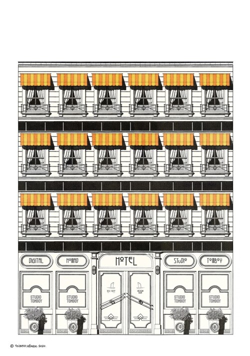 티보 에렘은 디지털 노마드를 주제로 가상의 호텔인 ‘스튜디오 톰보이 호텔’을 상상해 일러스트 작품을 완성했다. 티보 에렘 특유의 독특한 선이 돋보이는 이 작품에는 다양한 심볼과 그래픽이 적용돼 색다른 분위기가 느껴진다.