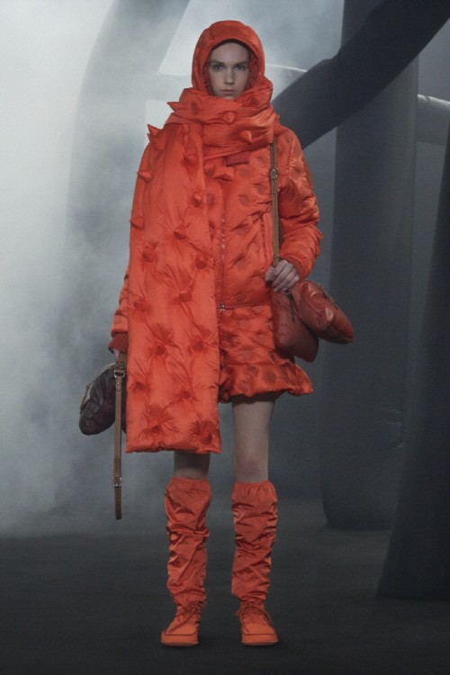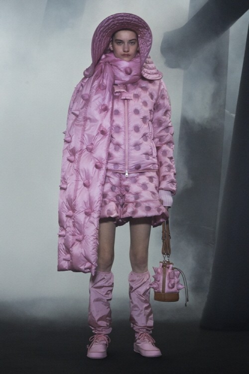 특히 패디드된 지퍼 풀러가 달린 블루종, 패딩 스카프, 챙이 넓은 모자와 밝은 컬러의 쇼츠들이 컬러와 형태에 초점을 맞춰 컬렉션 전반에 구성되었고 엠보싱된 도트 무늬와 돌출된 스파이크 같은 조각적인 모티브는 3차원적인 느낌을 더욱 부각 시킨다.