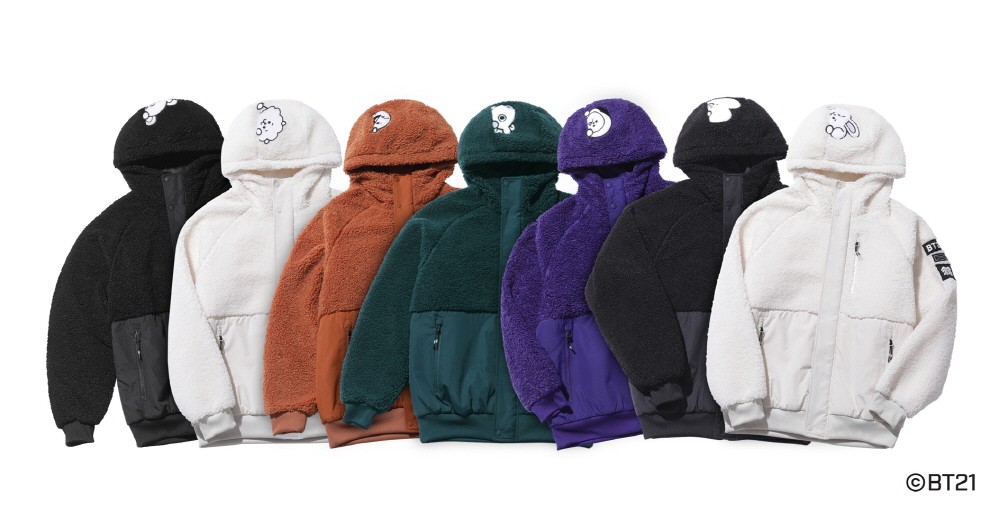 BT21 코오롱스포츠 플리스는 코야(KOYA), 알제이(RJ), 슈키(SHOOKY), 망(MANG), 치미(CHIMMY), 타타(TATA), 쿠키(COOKY) 총 7개 캐릭터를 디자인 요소로 적용했다. 캐주얼한 후드는 일체형으로 각각의 BT21의 캐릭터를 자수로 패치했으며 왼쪽 소매에 BT21과 ‘코오롱스포츠’의 로고를 와펜으로 담아 BT21 코오롱스포츠 플리스 만의 매력을 표현했다. 포근한 느낌의 플리스 소재와 BT21 캐릭터가 만나 한층 더 귀여운 느낌의 캐주얼 룩을 완성할 수 있게 한다.